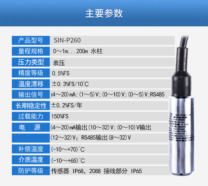 當前位置:首頁 > 液位變送器  >  聯測_SIN-P260投入式液位計/水位計_消防水箱_污水池_水庫液位_